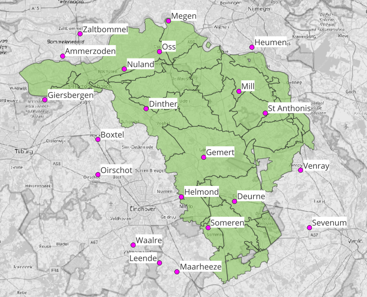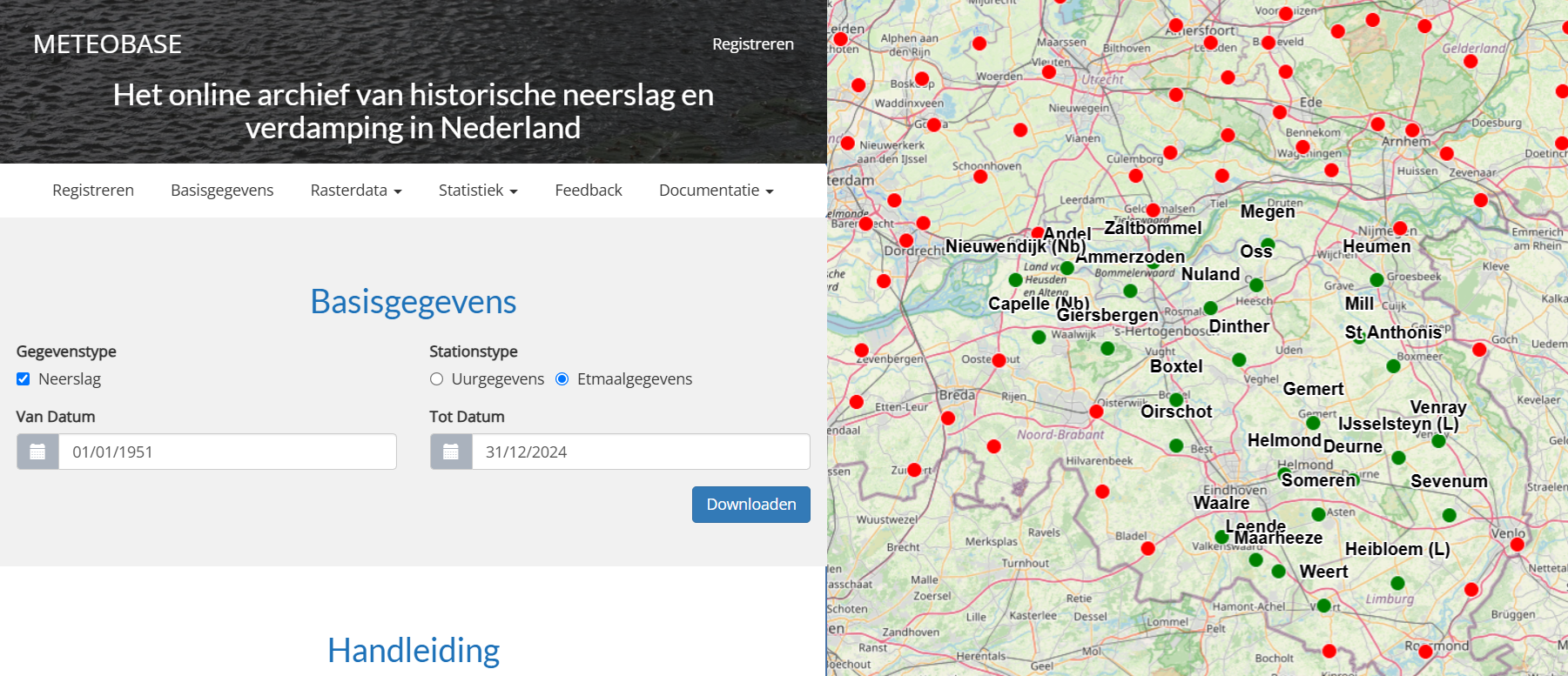 Op Meteobase selecteren we alle etmaalstations die binnen het beheergebied van Waterschap Aa en maas vallen, plus degene in de directe omgeving.