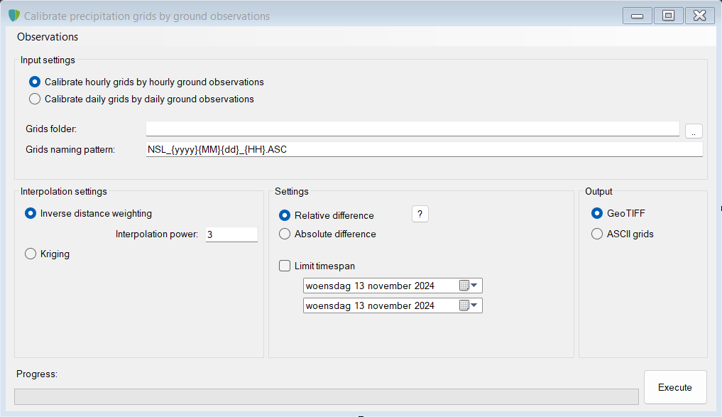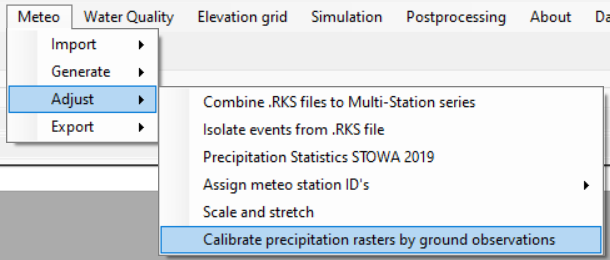 - Kies uit het menu de optie Meteo - Adjust - Calibrate precipitation rasters by ground observations.