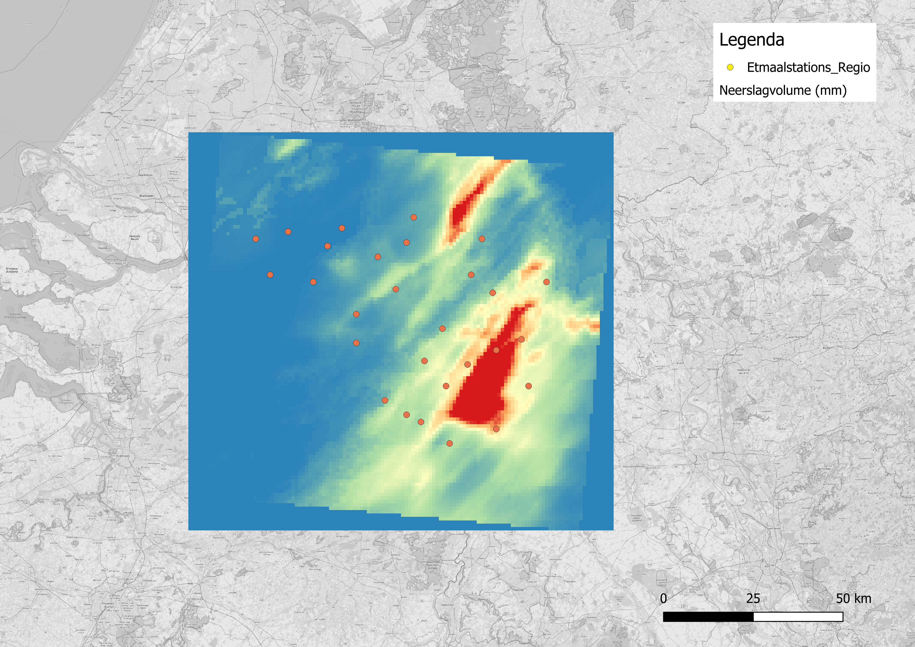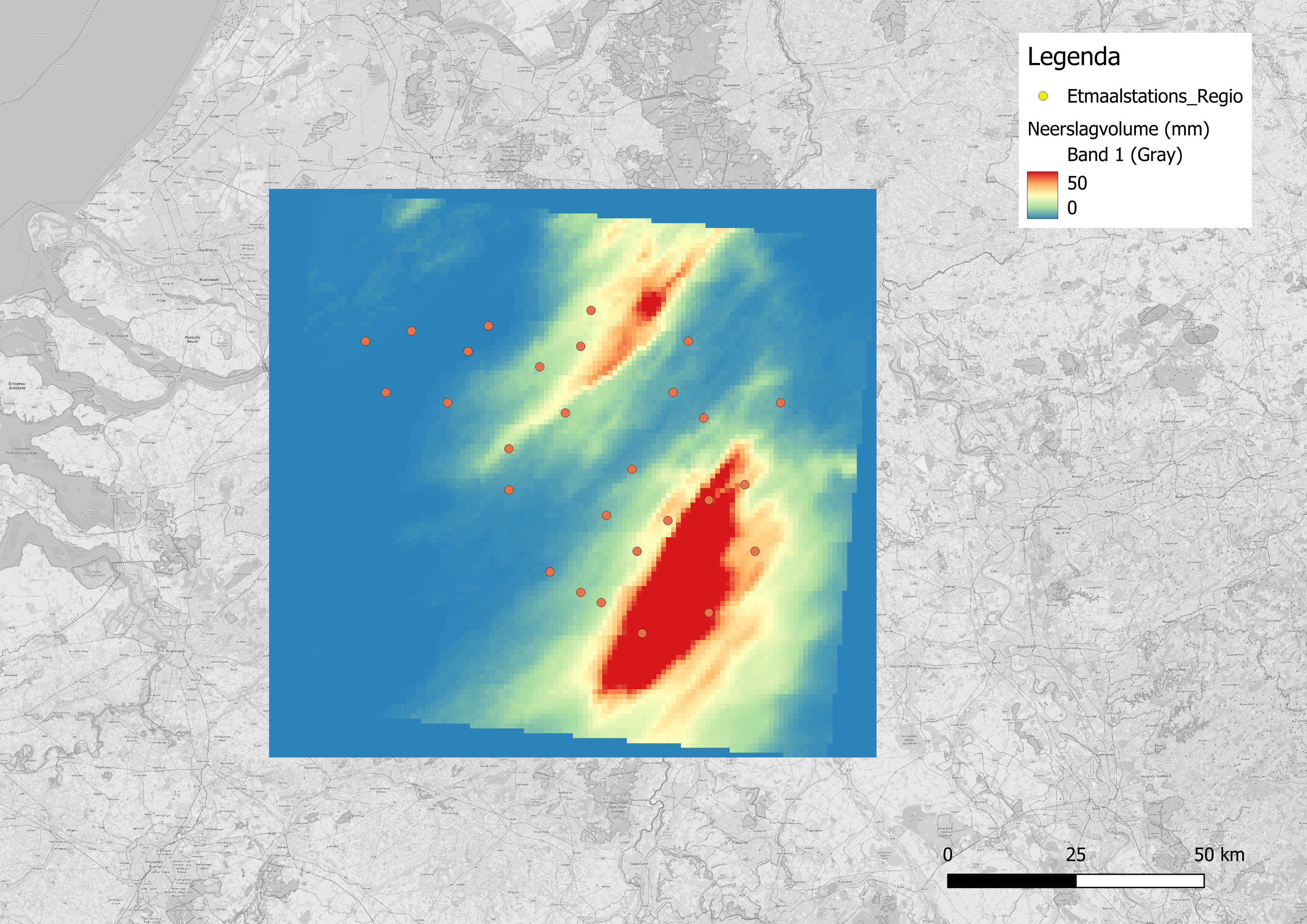 De getoonde bui valt volgens de rasters grotendeels tussen de etmaalstations in. Volgens Waterschap Aa en Maas kan het piekvolume van 144 mm die uit dot KNMI Final Reanalysisbeeld blijkt onmogelijk realistisch zijn. Echter de geografische ligging van deze hoge waarden, namelijk precies tussen de stations in, maakt een goede correctie bijzonder lastig. Deels lukt het doordat station Weert overlapt met het zuidelijke deel van deze bui. Echter het noordelijke blijft vrijwel onveranderd. We hebben helaas nog geen middelen om ook dat noordelijke deel te verifiëren en eventueel te corrigeren.↩︎