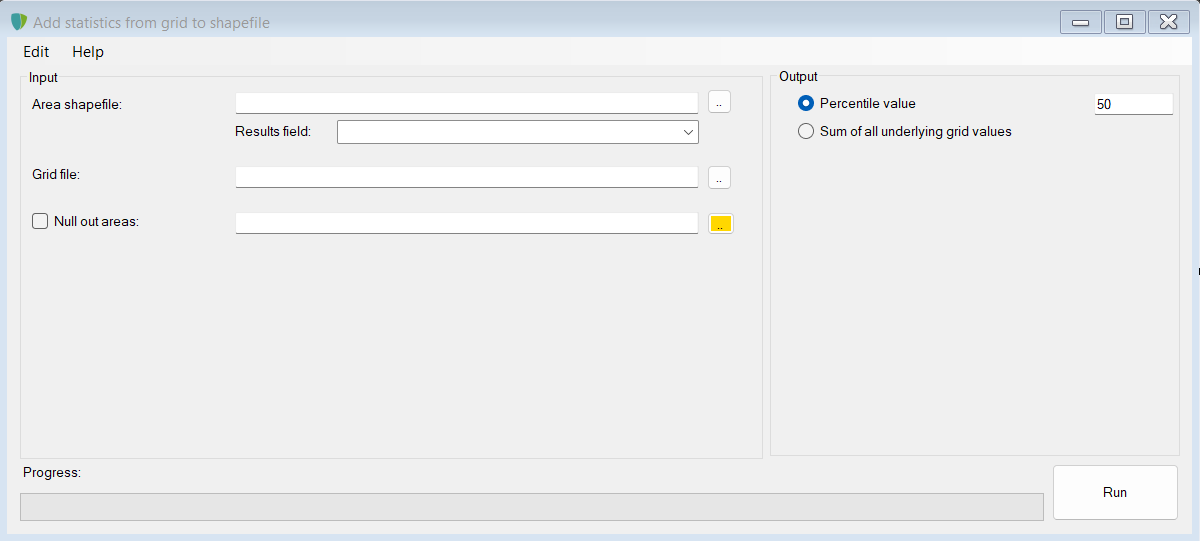 - Druk op <..> achter area shapefile om een shapefile te kiezen. Voor iedere polygoon in dit bestand zullen statistieken worden gegenereerd uit het onderliggende raster
