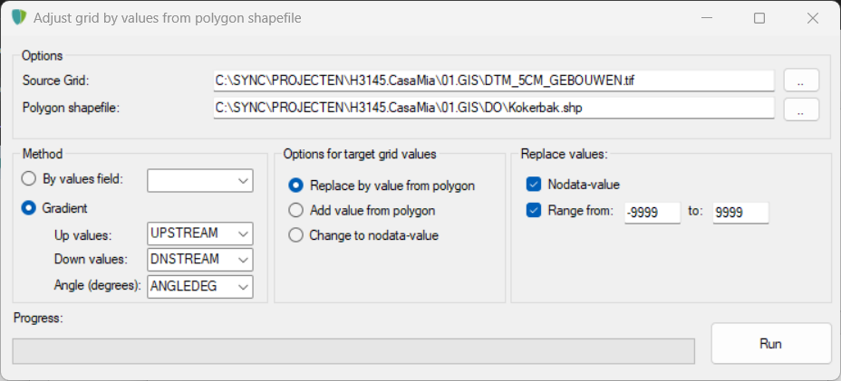 - Standaard is de methode ‘By values field’. In dat geval selecteert u het gegevensveld wat de nieuwe waarde (één waarde per polygoon) bevat, die zullen worden ingebrand in het grid. Geavanceerder is de methode ‘Gradient’. In dat geval geeft u aan welke velden resp. de ‘van’ en ‘naar’ waarden bevatten en de hoek (in graden t.o.v. de zuid-noord-as) waarover de gradiënt moet worden toegepast.