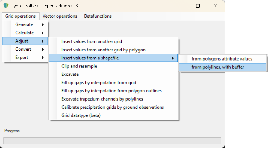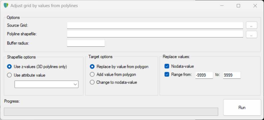 De optie ‘from polylines, with buffer’ geeft de gebruiker de mogelijkheid om een buffer rond de shapefile met polylines te leggen en de gewenste waardes in het onderliggende grid te branden.